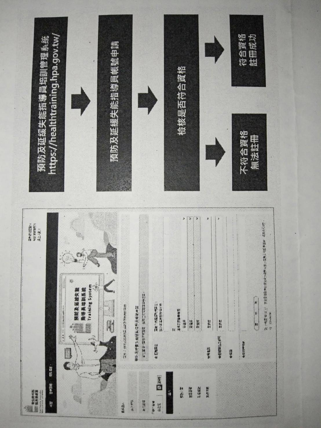 一、請已具備指導員資格者,先至「預防及延緩失能指導員培訓管理系統」(網站連結https://healthtraining.hpa.gov.tw/;自本署官網首頁進行連結)完成註冊,方能在本系統進行線上課程及測驗。