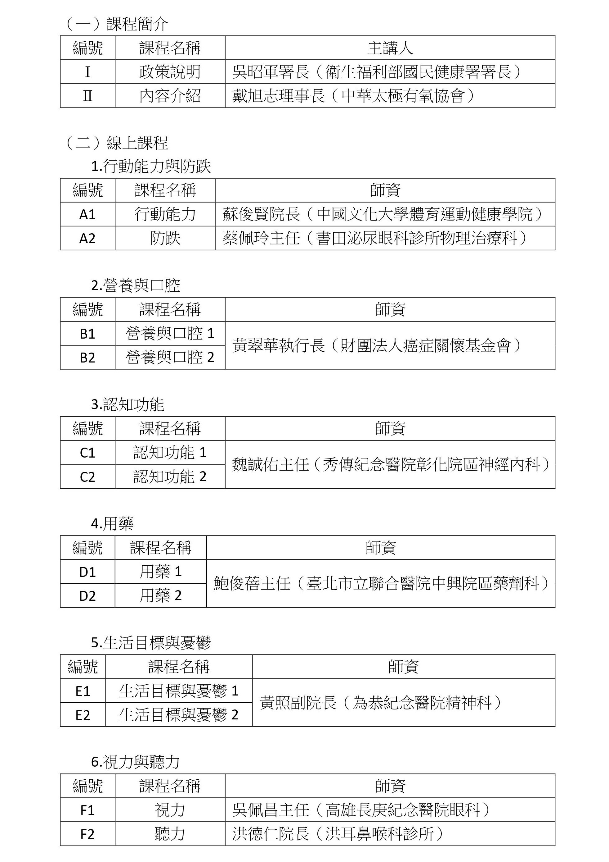 1.線上課程:主要依據ICOPE設計核心課程,包括行動能力與防跌、營養與口腔、認知功能、用藥、生活目標與憂傷、視力與聽力等。